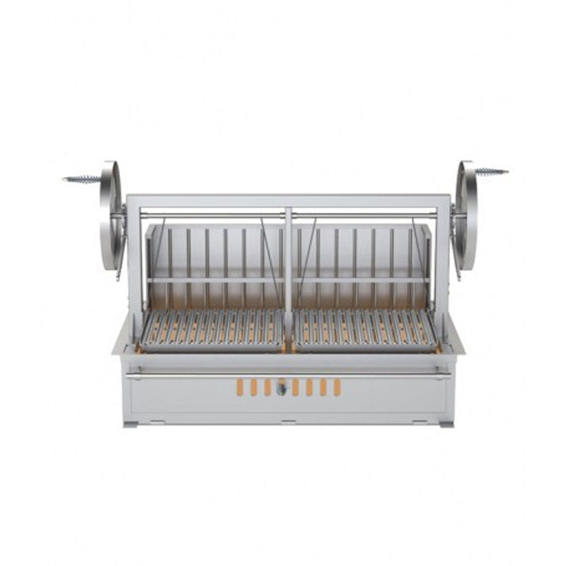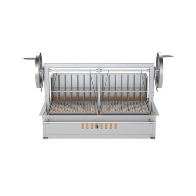 The rear-mounted removable brasero provides consistent heat for searing and slow cooking, while the double V-channel grates efficiently channel fats and juices into the drip tray—reducing flare-ups and enhancing flavor.